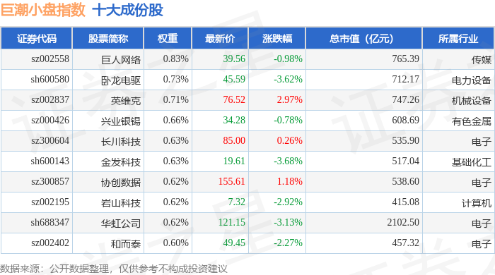 证券之星消息,10月16日,巨潮小盘(399316)指数报收于5848.82点,跌1.04%,成交2870.96亿元,换手率1.89%。当日该指数成份股中,上涨的有110家,海峡股份以10.03%的涨幅领涨,下跌的有381家,中国核建以7.59%的跌幅领跌。