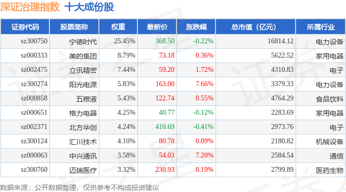 证券之星消息,10月16日,深证治理(399328)指数报收于11077.27点,涨0.73%,成交1107.04亿元,换手率1.8%。当日该指数成份股中,上涨的有15家,阳光电源以7.66%的涨幅领涨,下跌的有24家,华菱钢铁以5.7%的跌幅领跌。