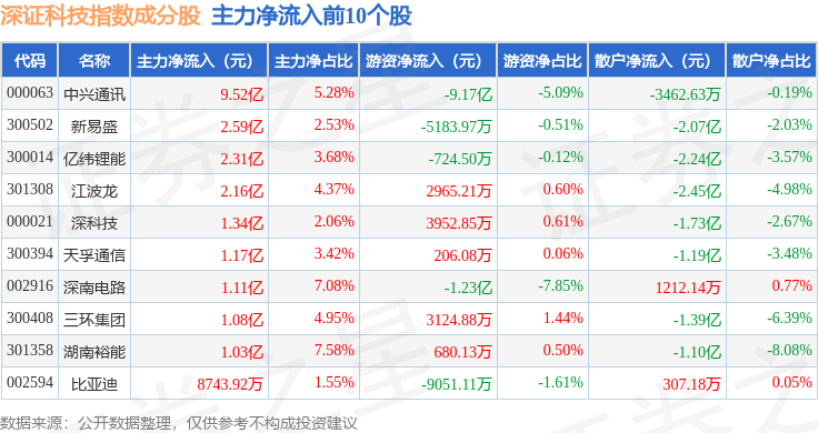 资金流向方面,深证科技(399339)指数成份股当日主力资金净流出合计54.3亿元,游资资金净流入合计14.17亿元,散户资金净流入合计40.13亿元。成份股资金流向详情见下表: