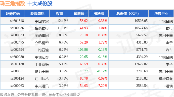 证券之星消息,10月16日,珠三角(399356)指数报收于10560.63点,涨0.44%,成交1049.3亿元,换手率1.15%。当日该指数成份股中,上涨的有17家,中兴通讯以7.2%的涨幅领涨,下跌的有23家,领益智造以3.51%的跌幅领跌。