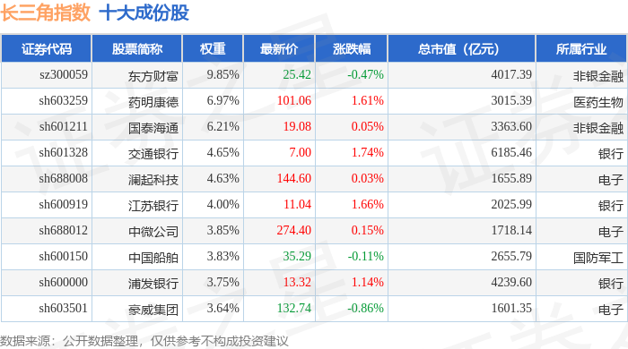 证券之星消息,10月16日,长三角(399355)指数报收于3735.04点,涨0.16%,成交725.54亿元,换手率0.83%。当日该指数成份股中,上涨的有21家,中国太保以2.17%的涨幅领涨,下跌的有17家,恒立液压以4.48%的跌幅领跌。