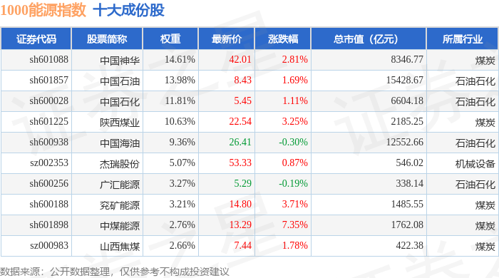 证券之星消息,10月16日,1000能源(399381)指数报收于2960.01点,涨1.84%,成交181.67亿元,换手率0.46%。当日该指数成份股中,上涨的有20家,中煤能源以7.35%的涨幅领涨,下跌的有6家,石化油服以1.42%的跌幅领跌。