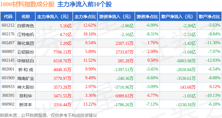 资金流向方面,1000材料(399382)指数成份股当日主力资金净流出合计97.33亿元,游资资金净流入合计18.8亿元,散户资金净流入合计78.52亿元。成份股资金流向详情见下表: