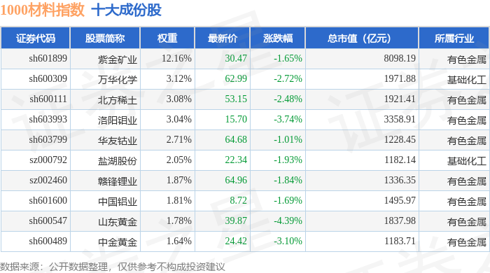 证券之星消息,10月16日,1000材料(399382)指数报收于3399.45点,跌1.89%,成交1371.5亿元,换手率2.01%。当日该指数成份股中,上涨的有15家,白银有色以10.0%的涨幅领涨,下跌的有119家,盛和资源以7.43%的跌幅领跌。