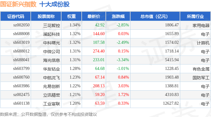 证券之星消息,10月16日,国证新兴(399392)指数报收于3052.34点,跌0.14%,成交3272.16亿元,换手率1.24%。当日该指数成份股中,上涨的有40家,阳光电源以7.66%的涨幅领涨,下跌的有59家,洛阳钼业以3.74%的跌幅领跌。