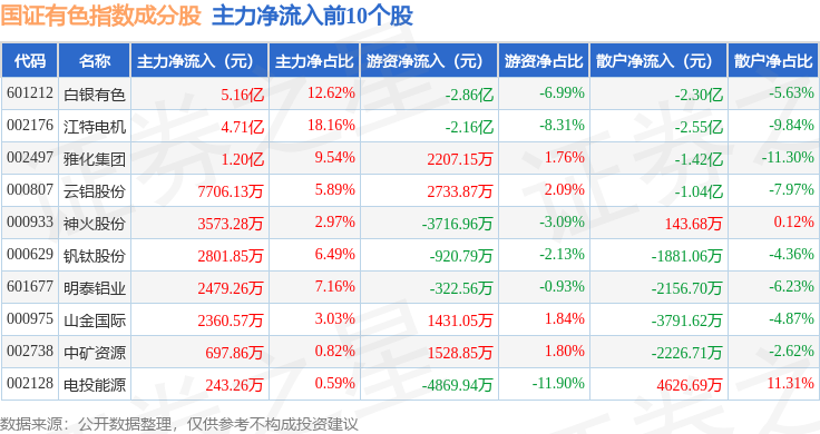 资金流向方面,国证有色(399395)指数成份股当日主力资金净流出合计73.38亿元,游资资金净流入合计12.42亿元,散户资金净流入合计60.97亿元。成份股资金流向详情见下表: