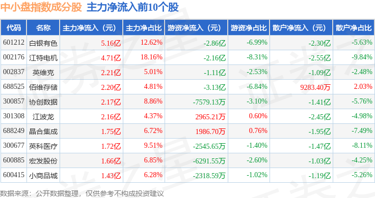 资金流向方面,中小盘(399401)指数成份股当日主力资金净流出合计245.88亿元,游资资金净流入合计68.51亿元,散户资金净流入合计177.37亿元。成份股资金流向详情见下表: