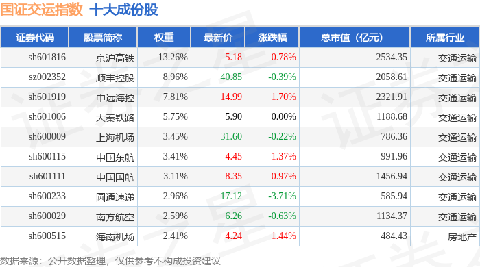 证券之星消息,10月16日,国证交运(399433)指数报收于1705.98点,涨0.14%,成交204.24亿元,换手率0.84%。当日该指数成份股中,上涨的有27家,安通控股以9.89%的涨幅领涨,下跌的有27家,申通快递以7.0%的跌幅领跌。