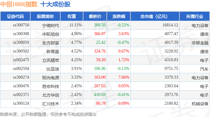 证券之星消息,10月16日,中创100R(399611)指数报收于3130.83点,涨0.17%,成交2361.98亿元,换手率1.68%。当日该指数成份股中,上涨的有36家,阳光电源以7.66%的涨幅领涨,下跌的有64家,华大九天以4.59%的跌幅领跌。