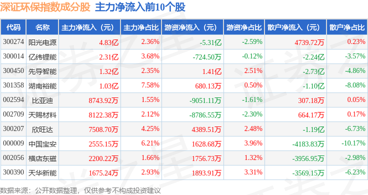 资金流向方面,深证环保(399638)指数成份股当日主力资金净流出合计19.55亿元,游资资金净流入合计6.71亿元,散户资金净流入合计12.84亿元。成份股资金流向详情见下表: