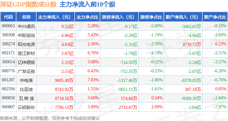 资金流向方面,深证GDP(399648)指数成份股当日主力资金净流出合计23.43亿元,游资资金净流出合计1.78亿元,散户资金净流入合计25.21亿元。成份股资金流向详情见下表: