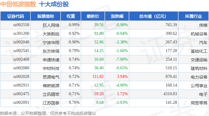 证券之星消息,10月16日,中创低波(399665)指数报收于2301.27点,跌0.63%,成交1335.33亿元,换手率1.59%。当日该指数成份股中,上涨的有47家,楚江新材以10.03%的涨幅领涨,下跌的有151家,申通快递以7.0%的跌幅领跌。