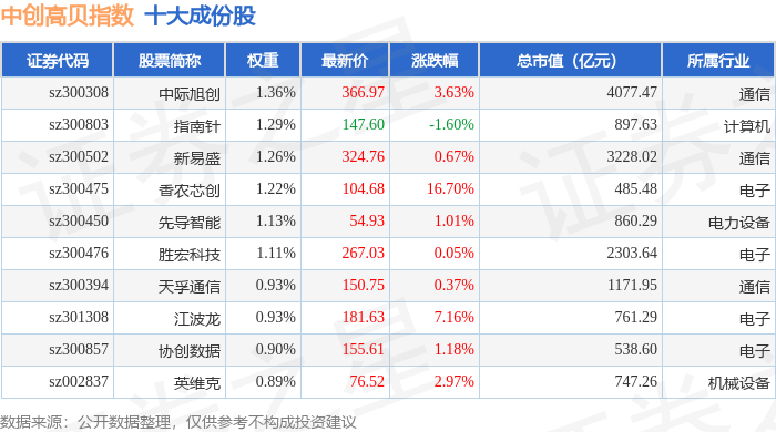 证券之星消息,10月16日,中创高贝(399666)指数报收于1943.63点,跌0.84%,成交2559.36亿元,换手率3.21%。当日该指数成份股中,上涨的有45家,香农芯创以16.7%的涨幅领涨,下跌的有154家,飞荣达以8.64%的跌幅领跌。
