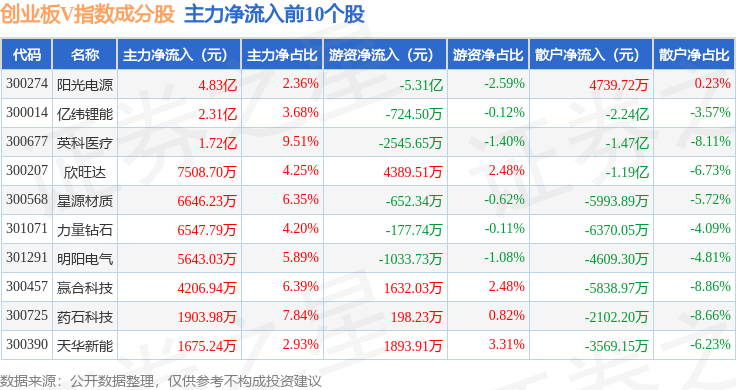 资金流向方面,创业板V(399668)指数成份股当日主力资金净流出合计38.02亿元,游资资金净流入合计14.48亿元,散户资金净流入合计23.54亿元。成份股资金流向详情见下表: