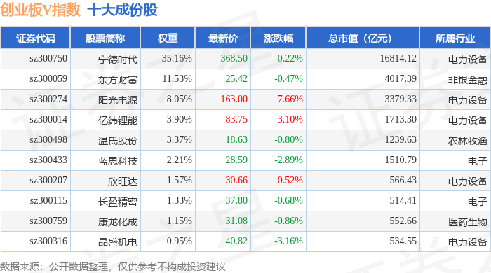 证券之星消息,10月16日,创业板V(399668)指数报收于5322.54点,涨0.12%,成交972.25亿元,换手率2.53%。当日该指数成份股中,上涨的有26家,阳光电源以7.66%的涨幅领涨,下跌的有73家,金力永磁以5.24%的跌幅领跌。