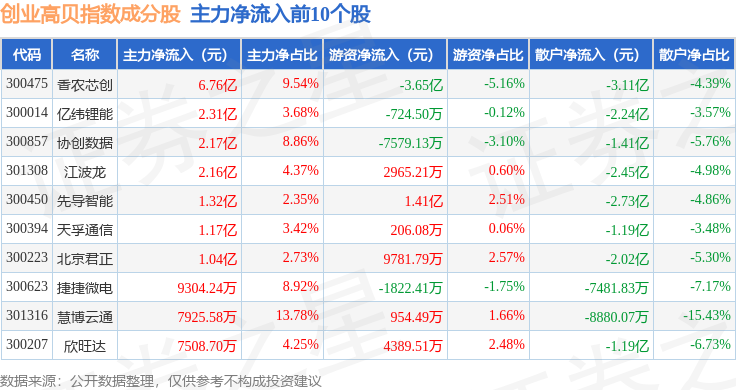 资金流向方面,创业高贝(399694)指数成份股当日主力资金净流出合计27.23亿元,游资资金净流入合计15.36亿元,散户资金净流入合计11.88亿元。成份股资金流向详情见下表: