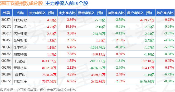 资金流向方面,深证节能(399695)指数成份股当日主力资金净流出合计31.57亿元,游资资金净流入合计10.55亿元,散户资金净流入合计21.03亿元。成份股资金流向详情见下表: