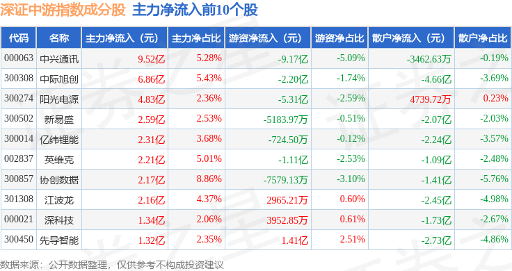 资金流向方面,深证中游(399705)指数成份股当日主力资金净流出合计47.34亿元,游资资金净流入合计15.08亿元,散户资金净流入合计32.26亿元。成份股资金流向详情见下表: