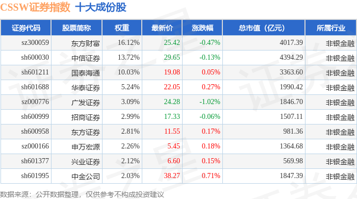 证券之星消息,10月16日,CSSW证券(399707)指数报收于6812.46点,跌0.29%,成交450.44亿元,换手率1.22%。当日该指数成份股中,上涨的有11家,东兴证券以2.31%的涨幅领涨,下跌的有37家,湘财股份以2.15%的跌幅领跌。