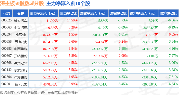 资金流向方面,深主板50(399750)指数成份股当日主力资金净流出合计10.14亿元,游资资金净流出合计5.56亿元,散户资金净流入合计15.7亿元。成份股资金流向详情见下表: