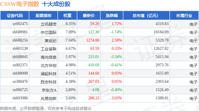 证券之星消息,10月16日,CSSW电子(399811)指数报收于5684.35点,跌0.47%,成交1571.46亿元,换手率2.08%。当日该指数成份股中,上涨的有16家,法拉电子以5.28%的涨幅领涨,下跌的有44家,沪硅产业以4.03%的跌幅领跌。