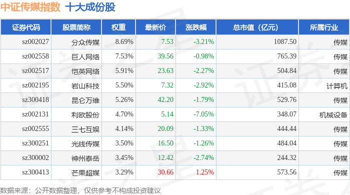 资金流向方面,中证传媒(399971)指数成份股当日主力资金净流出合计21.33亿元,游资资金净流入合计4.11亿元,散户资金净流入合计17.22亿元。成份股资金流向详情见下表: