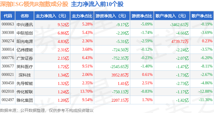 资金流向方面,深指ESG领先R(470029)指数成份股当日主力资金净流出合计75.32亿元,游资资金净流入合计14.52亿元,散户资金净流入合计60.8亿元。成份股资金流向详情见下表: