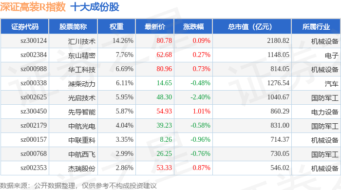 证券之星消息,10月16日,深证高装R(470037)指数报收于3247.95点,跌0.36%,成交464.15亿元,换手率2.56%。当日该指数成份股中,上涨的有13家,华明装备以8.29%的涨幅领涨,下跌的有37家,杭氧股份以4.07%的跌幅领跌。