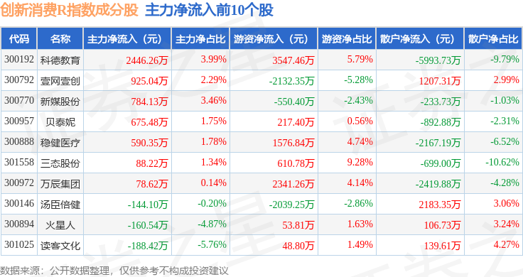 资金流向方面,创新消费R(470041)指数成份股当日主力资金净流出合计12.08亿元,游资资金净流入合计5.12亿元,散户资金净流入合计6.96亿元。成份股资金流向详情见下表: