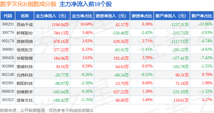 资金流向方面,数字文化R(470047)指数成份股当日主力资金净流出合计14.69亿元,游资资金净流入合计1.88亿元,散户资金净流入合计12.8亿元。成份股资金流向详情见下表: