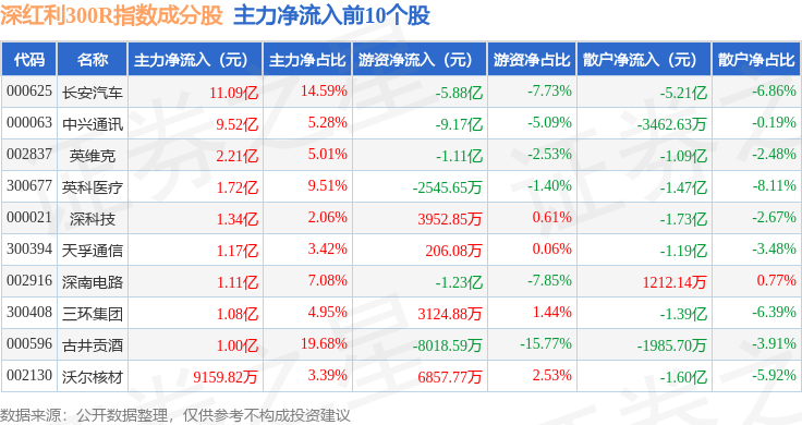 资金流向方面,深红利300R(470062)指数成份股当日主力资金净流出合计55.01亿元,游资资金净流入合计8.86亿元,散户资金净流入合计46.15亿元。成份股资金流向详情见下表: