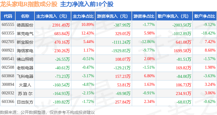 资金流向方面,龙头家电R(480028)指数成份股当日主力资金净流出合计18.74亿元,游资资金净流入合计3.82亿元,散户资金净流入合计14.92亿元。成份股资金流向详情见下表: