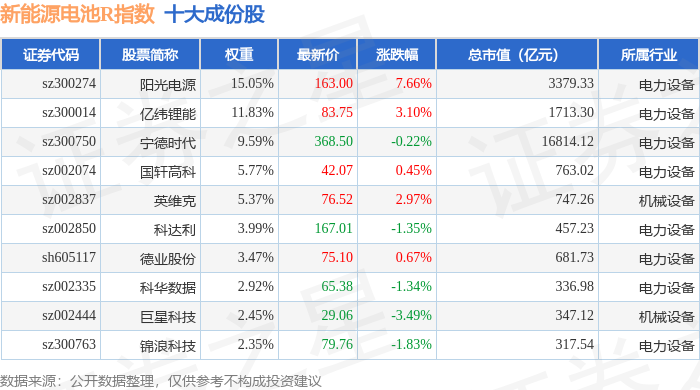 证券之星消息,10月16日,新能源电池R(480027)指数报收于3613.28点,涨1.1%,成交675.78亿元,换手率2.43%。当日该指数成份股中,上涨的有13家,阳光电源以7.66%的涨幅领涨,下跌的有37家,紫建电子以4.68%的跌幅领跌。