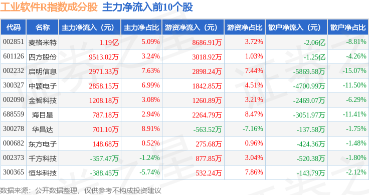 资金流向方面,工业软件R(480034)指数成份股当日主力资金净流出合计20.8亿元,游资资金净流入合计9.0亿元,散户资金净流入合计11.8亿元。成份股资金流向详情见下表: