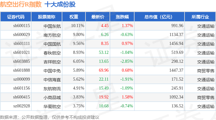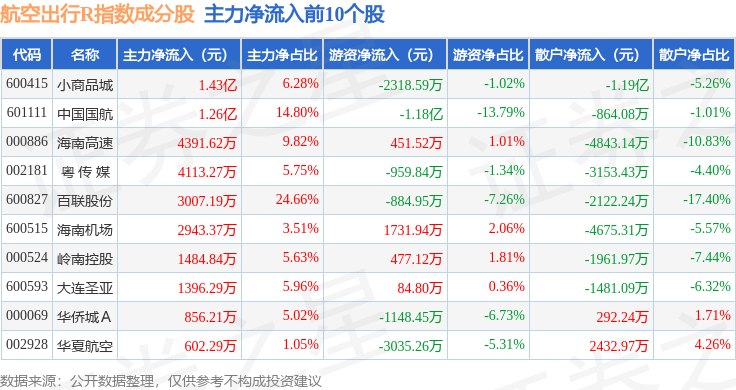 资金流向方面,航空出行R(480059)指数成份股当日主力资金净流出合计1.59亿元,游资资金净流出合计1.36亿元,散户资金净流入合计2.95亿元。成份股资金流向详情见下表: