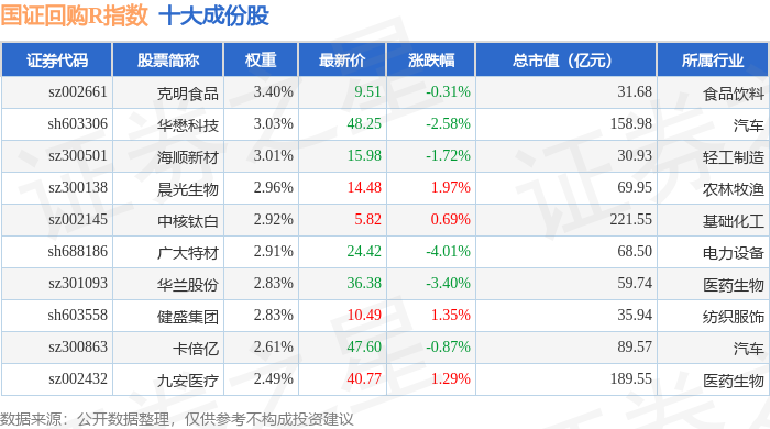 证券之星消息,10月16日,国证回购R(480063)指数报收于3914.93点,跌0.4%,成交137.63亿元,换手率1.31%。当日该指数成份股中,上涨的有15家,东鹏控股以10.05%的涨幅领涨,下跌的有33家,智动力以4.83%的跌幅领跌。