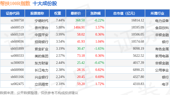 证券之星消息,10月16日,帮扶100R(480065)指数报收于2732.27点,涨0.61%,成交2699.48亿元,换手率0.51%。当日该指数成份股中,上涨的有63家,阳光电源以7.66%的涨幅领涨,下跌的有36家,洛阳钼业以3.74%的跌幅领跌。