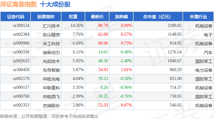 深证高装(970037)指数十大成份股详情如下: