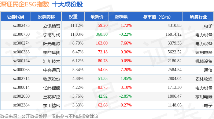深证民企ESG(970056)指数十大成份股详情如下:
