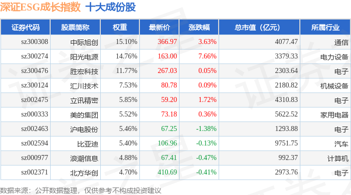 证券之星消息,10月16日,深证ESG成长(970060)指数报收于2060.72点,涨1.7%,成交1071.42亿元,换手率2.29%。当日该指数成份股中,上涨的有18家,阳光电源以7.66%的涨幅领涨,下跌的有32家,中核科技以3.97%的跌幅领跌。