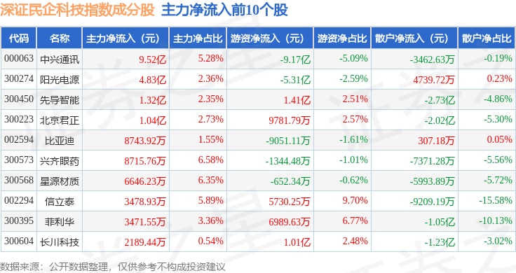 资金流向方面,深证民企科技(970059)指数成份股当日主力资金净流出合计8.83亿元,游资资金净流入合计3.44亿元,散户资金净流入合计5.39亿元。成份股资金流向详情见下表: