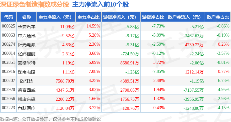 资金流向方面,深证绿色制造(970069)指数成份股当日主力资金净流出合计30.95亿元,游资资金净流出合计3.85亿元,散户资金净流入合计34.8亿元。成份股资金流向详情见下表: