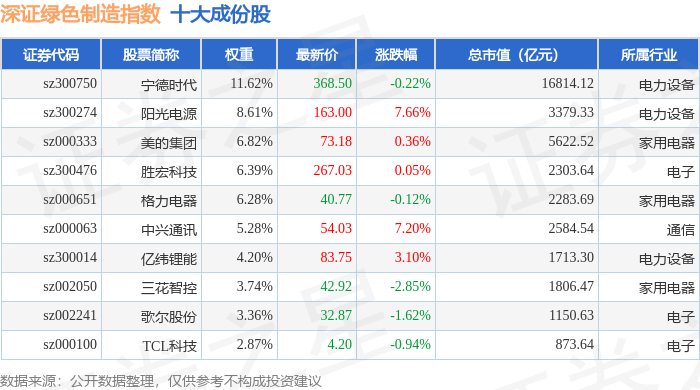 证券之星消息,10月16日,深证绿色制造(970069)指数报收于1878.24点,涨0.6%,成交1309.18亿元,换手率2.67%。当日该指数成份股中,上涨的有12家,阳光电源以7.66%的涨幅领涨,下跌的有38家,万向钱潮以6.69%的跌幅领跌。