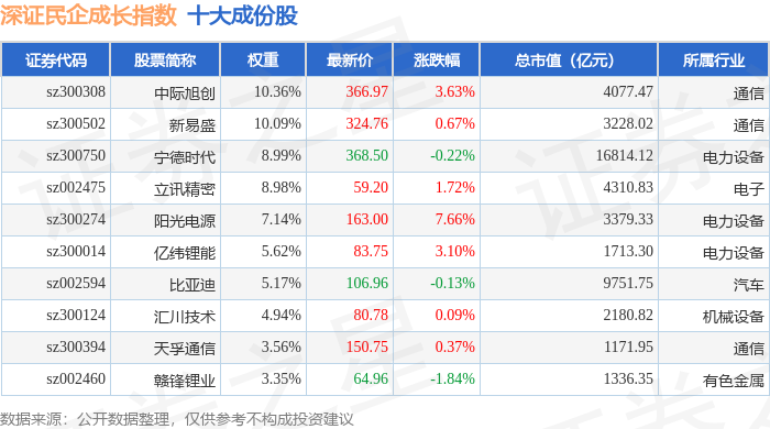 证券之星消息,10月16日,深证民企成长(970071)指数报收于3676.51点,涨0.91%,成交1237.91亿元,换手率3.04%。当日该指数成份股中,上涨的有15家,阳光电源以7.66%的涨幅领涨,下跌的有35家,广和通以5.18%的跌幅领跌。
