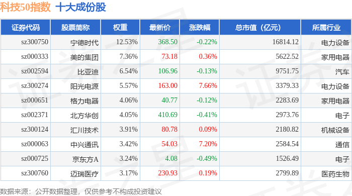 证券之星消息,10月16日,科技50(970080)指数报收于3213.04点,涨0.45%,成交1549.8亿元,换手率2.03%。当日该指数成份股中,上涨的有18家,阳光电源以7.66%的涨幅领涨,下跌的有31家,金风科技以4.36%的跌幅领跌。