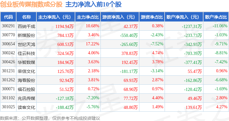资金流向方面,创业板传媒(970084)指数成份股当日主力资金净流出合计8.55亿元,游资资金净流入合计3.08亿元,散户资金净流入合计5.48亿元。成份股资金流向详情见下表: