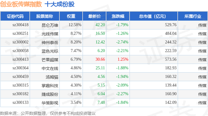 证券之星消息,10月16日,创业板传媒(970084)指数报收于1273.94点,跌1.68%,成交105.87亿元,换手率2.43%。当日该指数成份股中,上涨的有3家,新媒股份以1.34%的涨幅领涨,下跌的有37家,星辉娱乐以3.3%的跌幅领跌。