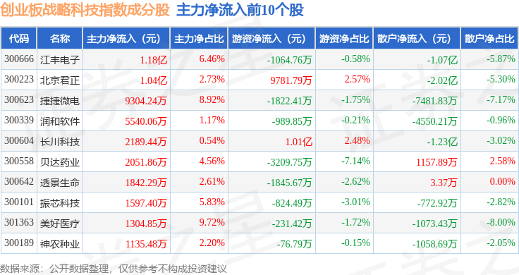 资金流向方面,创业板战略科技(971004)指数成份股当日主力资金净流出合计9.4亿元,游资资金净流入合计4.59亿元,散户资金净流入合计4.81亿元。成份股资金流向详情见下表: