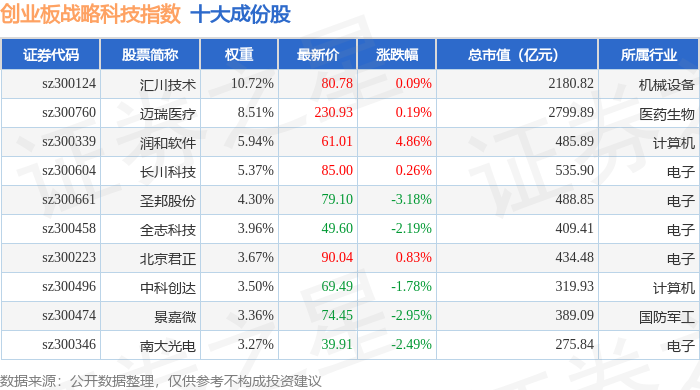 证券之星消息,10月16日,创业板战略科技(971004)指数报收于6553.14点,跌0.62%,成交401.53亿元,换手率3.31%。当日该指数成份股中,上涨的有15家,润和软件以4.86%的涨幅领涨,下跌的有35家,华大九天以4.59%的跌幅领跌。