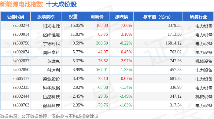 证券之星消息,10月16日,新能源电池(980027)指数报收于3357.96点,涨1.1%,成交675.78亿元,换手率2.43%。当日该指数成份股中,上涨的有13家,阳光电源以7.66%的涨幅领涨,下跌的有37家,紫建电子以4.68%的跌幅领跌。